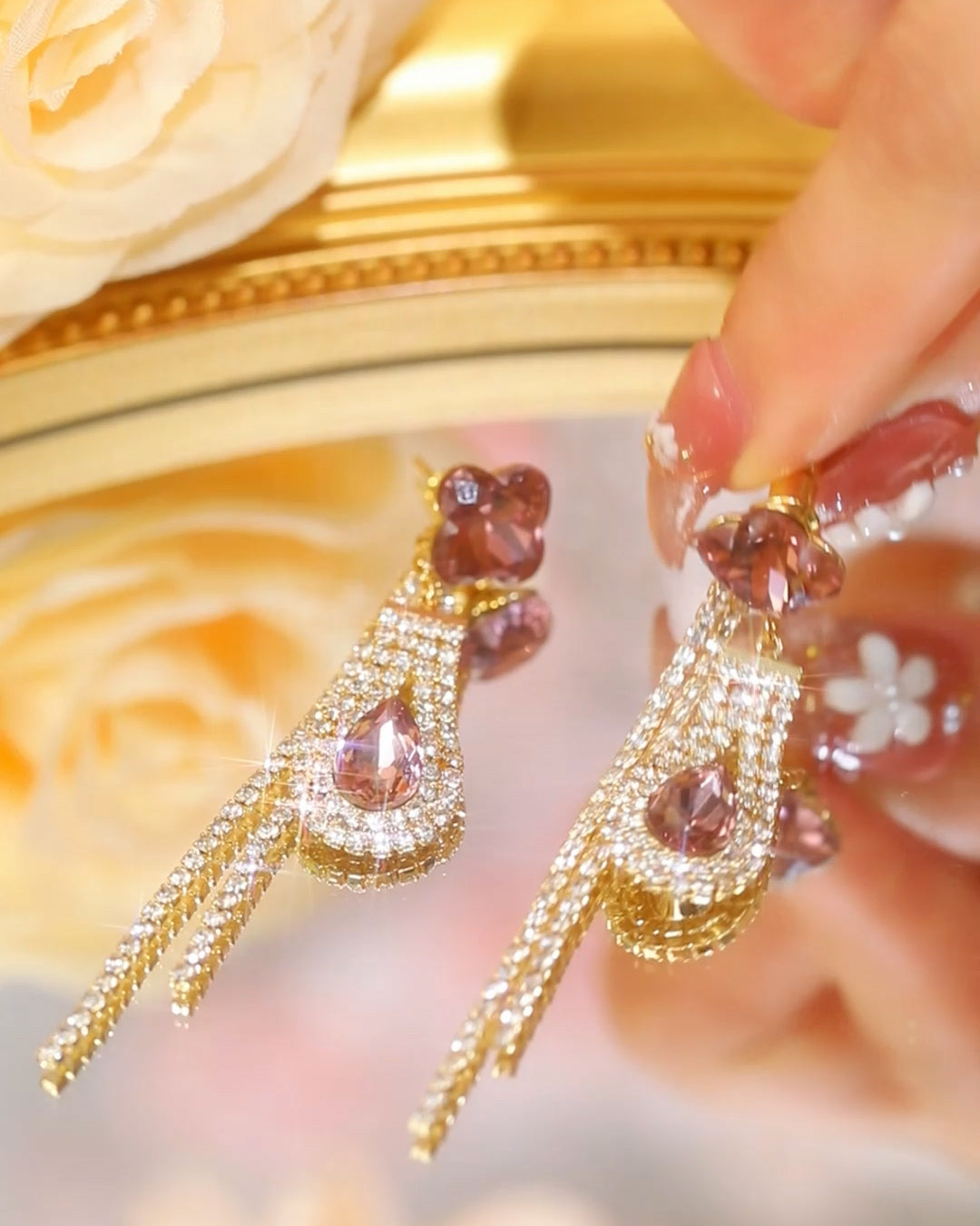"Love is the beauty of the soul" - St. Augustine. Our 18K Gold Plated Turquoise Delight Earrings will add a touch of beauty and love to any ensemble. Their stunning 3 carat water drop lab grown Eudialyte center is surrounded by 0.2 carat cubic zirconia studded tassel chains, giving an elegant and glamorous look. Perfect for special occasions or everyday wear.