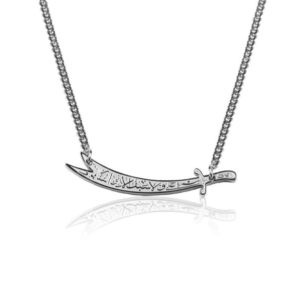 The Zulfiqar sword is engraved with Arabic Calligraphy that translates to: