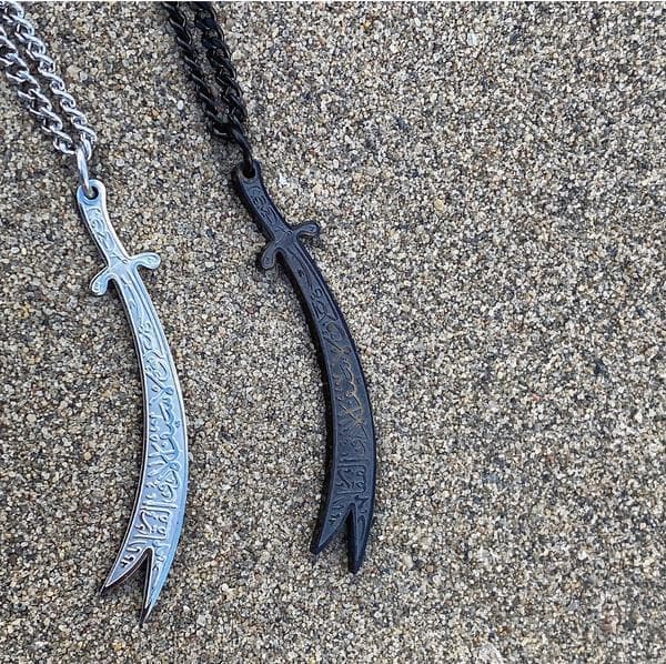 The Zulfiqar sword is engraved with Arabic Calligraphy that translates to: